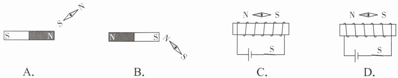D.根据右手螺旋定则,螺线管左端为N极,外部磁场方向从N极指向S极,小磁针N极指向与磁场方向一致,正确。