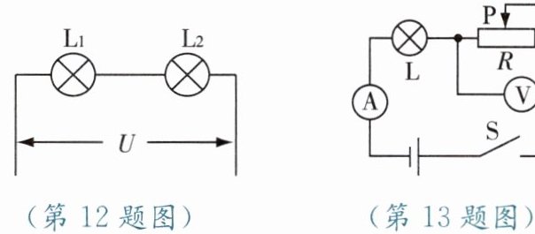 12. 如图所示,将规格分别为“6 V 3 W”和“6 V 6 W”的灯泡$L_1$、$L_2$串联(灯泡电阻不变),若要使其中一个灯泡长时间正常发光,则电源电压应为