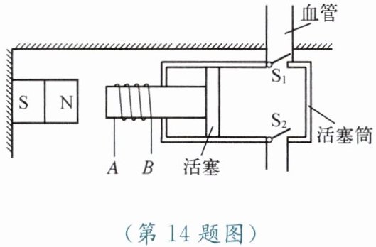 14. 人工心脏泵可短时间代替心脏工作,如图所示是该装置的示意图。线圈 AB 固定在用软铁制成的活塞柄上(相当于一个电磁铁),通电时线圈与活塞柄组成的系统与固定在左侧的磁体相互作用,从而带动活塞运动。活塞筒通过阀门与血管相通,阀门$S_1$只能向外开启,$S_2$只能向内开启。线圈中的电流从 B 流向 A 时,电磁铁的左端为