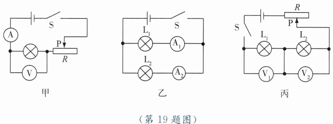 19. 在“探究影响电流做功的因素”活动中,同学们设计了如图甲、乙、丙所示的三种电路。