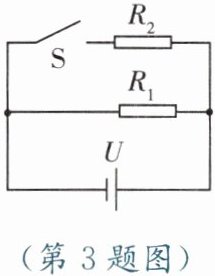 3. 如图所示,电源电压$U$保持不变,$R_1 = R_2$。若将开关$S$闭合,则$R_1$消耗的电功率将 (