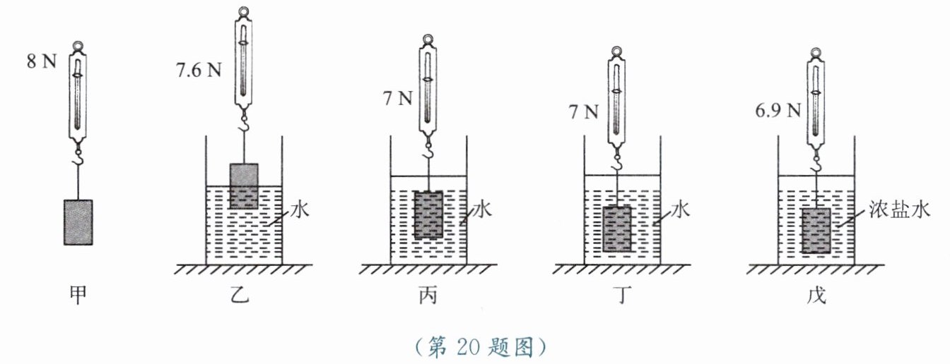 20. 在探究影响浮力大小的因素时,某学习小组做了如图所示的一系列实验。请从中选出一些图,针对浮力的大小与排开液体的体积、浸入深度或液体密度等因素进行探究,并通过分析弹簧测力计的示数,说明你的探究结果。