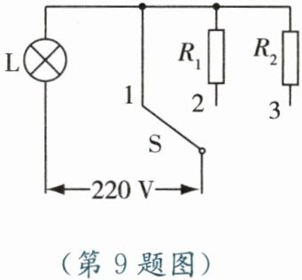9. 某同学设计了一种可调节灯泡亮度的电路,如图所示,$R_1 = 200 \Omega$,$R_2 = 484 \Omega$。当开关与触点1接触时,灯泡正常发光。已知灯泡L的规格为“220 V 100 W”,电源电压为220 V。当开关S分别与触点2、3接触时,灯泡亮度随之发生变化。设温度对灯丝电阻的影响可忽略不计。问:
