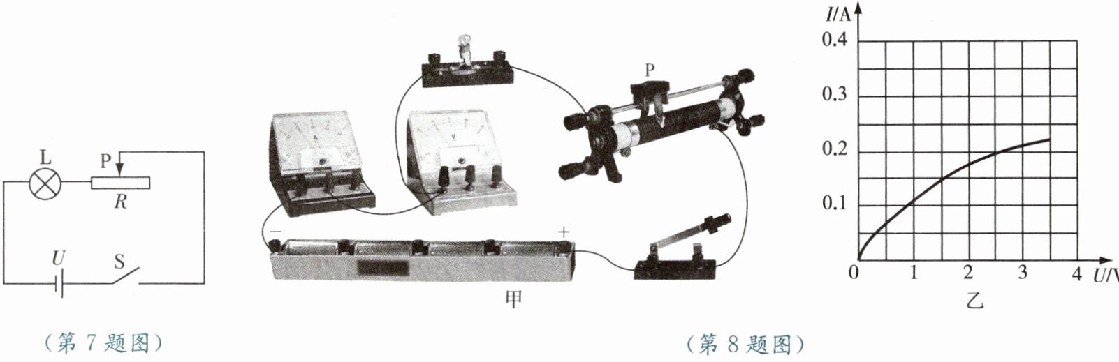 8. 小明在测定灯泡的电功率时,所用的器材有电压为6 V的电源、额定电压为2.5 V的灯泡,以及符合实验要求的滑动变阻器、电流表、电压表、开关和导线。如图甲所示是小明没有连接完的实物电路。