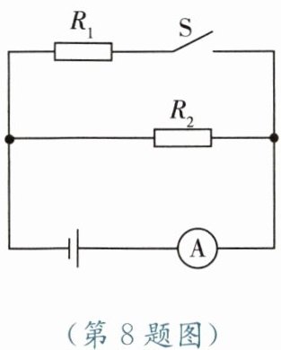 8. 如图所示的电路中,电源电压为$6\ V$,开关S断开时,电流表的示数为$0.3\ A$;开关S闭合时,电流表的示数为$0.5\ A$。由此可知,$R_2$的阻值是