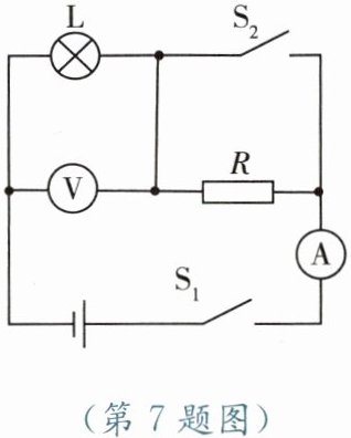 7. 如图所示的电路中,灯泡L上标有“$6\ V\ 3\ W$”字样。当开关$ S_1$、$ S_2$同时闭合时,L正常发光,则电压表测的是
