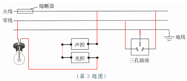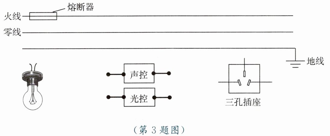 3. 居民楼内的楼道灯如果一直亮着会造成浪费。因此,人们在电路中安装光控开关和声控开关,以节约电能。光控开关在天黑时自动闭合,天亮时自动断开;声控开关在有人走动发出声音时闭合,无人走动时自动断开。请设计出只有在夜间且有声音时灯才亮的楼道灯自动控制电路,并用笔画线代替导线将图中的光控开关、声控开关、灯泡、三孔插座连入电路,要求三孔插座不受开关控制。