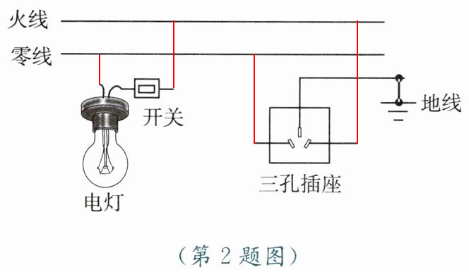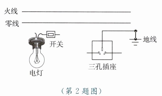 2. 请用笔画线代替导线,将图中连有开关的电灯和三孔插座接入家庭电路中。