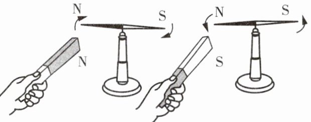 ;把条形磁体的S极靠近磁针的N极,可以看到它们互相