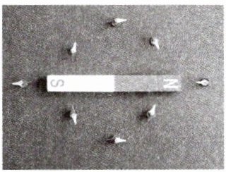 我们也可以用铁屑探究磁体周围的磁场。在玻璃板上均匀地撒上一层铁屑,然后将玻璃板平放在磁体上,轻轻敲击玻璃板,铁屑分布如下图所示。