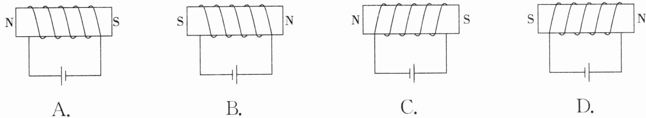 对于选项C:电流从螺线管左端流入,右端流出,四指弯曲方向为从左向右,大拇指指向右端,应为N极,而标注为S极,错误。