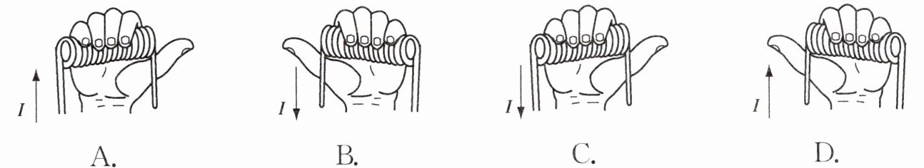 对于选项B:电流从螺线管右端流入,左端流出,四指弯曲方向为从右向左,大拇指指向左端,应为N极,而标注为S极,错误。