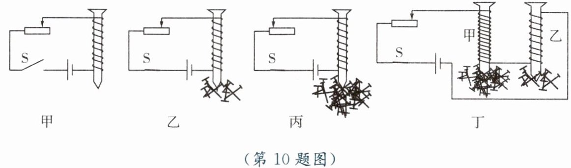 答案:10. (1) 磁性强弱 (2) 甲和乙 (3) 乙和丙 (4) 电流大小一定时