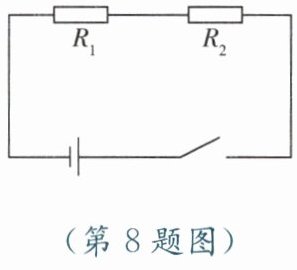 8. 如图所示,$R_1$ 和 $R_2$ 串联在 $12 V$ 的电源上,$R_2=100\ \Omega$,通过 $R_1$ 的电流是 $50 mA$。$2 min$ 内电流通过 $R_1$ 和 $R_2$ 各做了多少功?