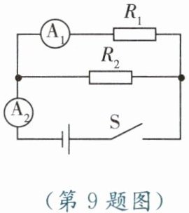 9. 在如图所示的电路中,电阻 $R_2=20\ \Omega$,开关 $ S$ 闭合后,电流表$ A_1$、$ A_2$的示数分别为 $0.2 A$ 和 $0.5\mathrm{ A}$。求: