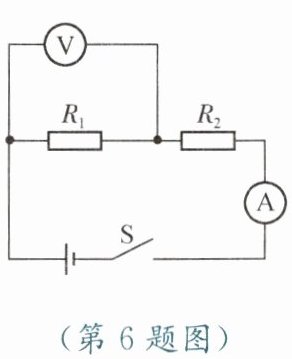 6. 如图所示,电阻 $R_2$ 为 $4\ \Omega$,电源电压保持不变。当闭合开关 $ S$ 时,电压表示数为 $4 V$,电流表示数为 $0.5 A$,则电阻 $R_1$ 的阻值为