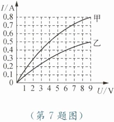 7. 甲、乙两灯的电流随电压变化的关系图像如图所示,若将甲、乙两灯并联接人 $4 V$ 的电路中,两灯在 $5 min$ 内消耗的总电能为
