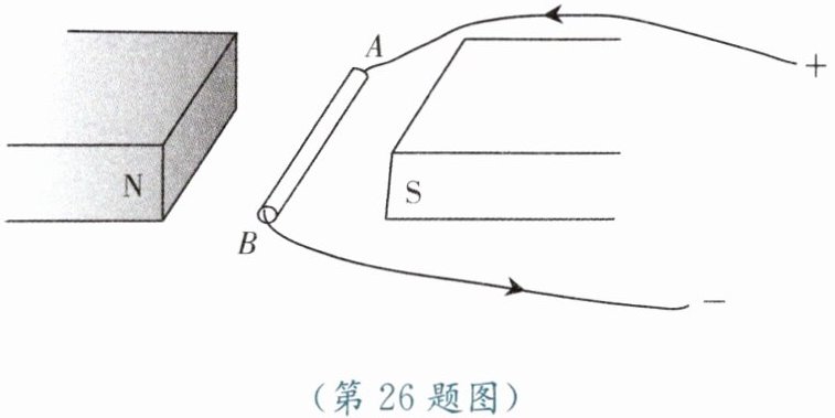 26. (6分)如图所示是检验磁场对通电导体作用力的实验装置。当导线AB中有沿图示方向的电流通过时,它所受磁场力的方向向上。
