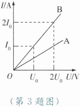 解:由图像得,$R_A=\frac{2U_0}{I_0}$,$R_B=\frac{U_0}{I_0}$,则$R_A=2R_B$。