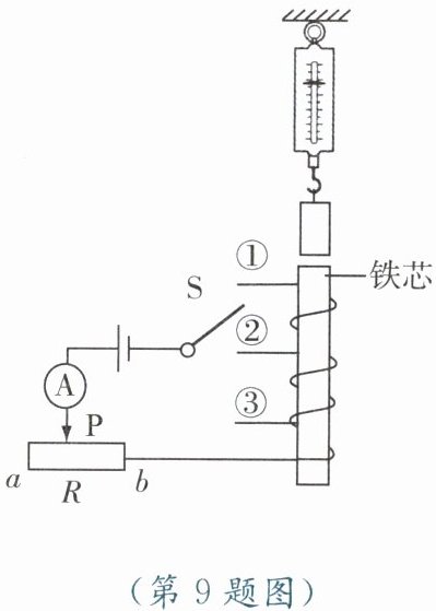 9. 如图所示,弹簧测力计下面挂着条形铁块,螺线管中插有铁芯。开关 S 置于触点②位置时电流表示数为 $I$,弹簧测力计的示数为 $F$。要使弹簧测力计的示数变大,下列操作中能够实现的是