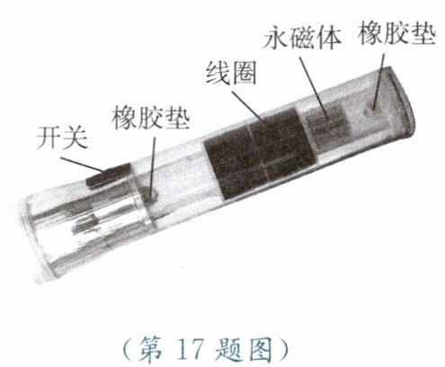 17. 如图所示是一种环保型手电筒。使用时,只要来回摇晃手电筒,使永磁体在手电筒中的两个橡胶垫之间来回运动,灯泡就能发光。这种手电筒是根据