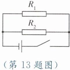 13. 如图所示,电阻$R_1$和$R_2$并联在电路中。已知$R_1 = 10 \Omega$,通过$R_2$的电流为 1 A,$R_2$消耗的电功率为 6 W,则$R_2$的阻值为