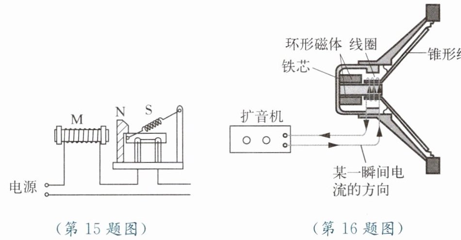 16. 有时候,人们也可用扬声器代替话筒。如图所示,人对着扬声器的锥形纸盆说话,声音使与纸盆相连的线圈在