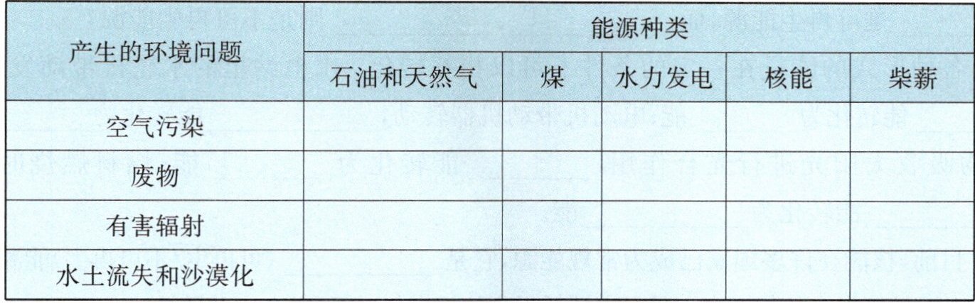 5. 在消耗各种能源时,可能对环境造成什么样的破坏?在下表中,用“√”表示大量消耗该种能源所产生的相应环境问题。