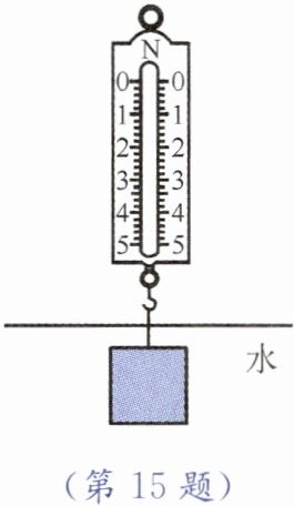 15. 小亮在测量浮力时发现,金属块浸没在密度不同的液体中,弹簧测力计示数不同。于是,他用弹簧测力计和重为$4\ N$、体积为$1×10^{-4}\ m^3$的金属块组装成密度计,将金属块浸没在不同液体中静止,来探究液体密度与弹簧测力计示数的对应关系。