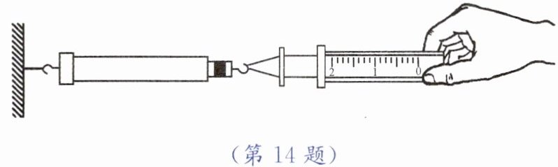 14. 如图是小明利用$V = 2\ mL$的注射器、弹簧测力计、刻度尺等器材估测大气压值的情况。