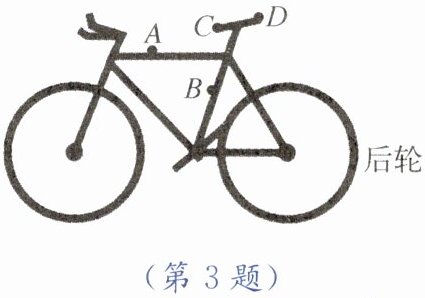 3. 如图所示,停放自行车时,若要从$A$、$B$、$C$、$D$四点中选择一点施加竖直向上的力,将后轮略微提起,其中最省力的点是(