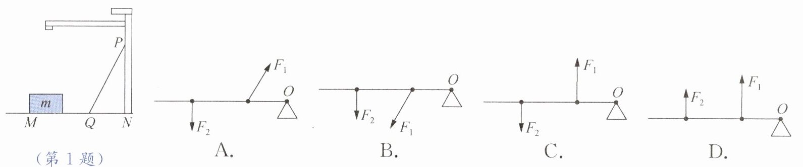 1. 如图所示是教室壁挂式实物展示台示意图,$MN$为展示台,$PQ$为连杆拉住展示台,$m$为展示物。下列是展示台承载展示物时杠杆的示意图,其中正确的是(