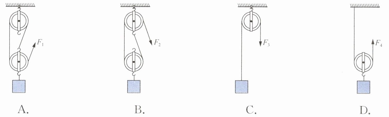 4. 如图所示,分别使用图中四种装置匀速提升同一重物,不计滑轮重、绳重和摩擦,最省力的是(