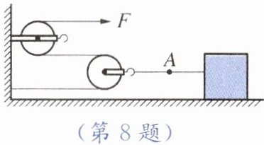 8. 如图所示,利用轻质滑轮组匀速拉动水平地面上重为$300\ N$的物体,拉力$F$的大小为$30\ N$。若物体和地面之间的摩擦力大小为$45\ N$,则$A$处的拉力大小和滑轮组的机械效率分别为(