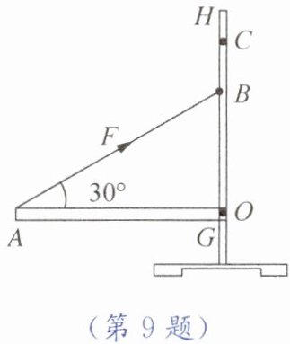 9. 如图所示为小华制作的斜拉索大桥模型,她用长$30\ cm$、重$5\ N$的质地均匀的木条$OA$做桥面,立柱$GH$做桥塔。$OA$可绕$O$点转动,$A$端用细线与$GH$上的$B$点相连,桥面$OA$实质上是一种