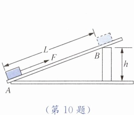 10. 小明在探究斜面的机械效率时,将粗糙程度均匀的长木板用支架支撑构成斜面,如图所示。用刻度尺量出斜面底端$A$点到斜面上$B$点的距离$L$为$80\ cm$,$B$点距水平地面高度$h$为$20\ cm$。沿斜面向上用$0.8\ N$的拉力$F$将重为$2\ N$的木块匀速拉到$B$点,用时$2\ s$,则这段过程中拉力$F$做功的功率$P = $