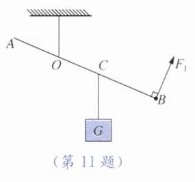 11. 如图所示,$O$为支点,杠杆$AB$平衡时,请画出施加在杠杆上最小动力$F_1$的示意图。