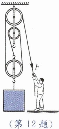 12. 如图所示,工人用滑轮组提升重物,已知重物重力$G_{ 物} = 1000\ N$,动滑轮重力$G_{ 动} = 200\ N$。在工人用力$F$的作用下,重物匀速上升,$30\ s$到达规定高度$6\ m$处。(不计绳重和机械之间的摩擦)