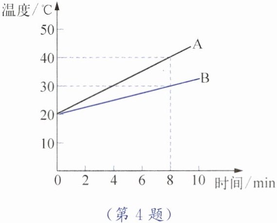 $m_A=0.1\ kg$,$m_B=0.4\ kg$,$0\sim8\ min$内$\Delta t_A=40° C-20° C=20° C$,$\Delta t_B=30° C-20° C=10° C$。