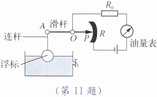 11. 如图所示是测量油箱内油量的装置,其中$R$是滑动变阻器的电阻片,$AP$是轻质滑杆,且$AO > OP$,$P$是滑杆上可沿电阻片滑动的滑片,$R_0$是定值电阻。油量减少时,浮标通过连杆带动滑杆绕$O$点转动,使滑片$P$在$R$上滑动。