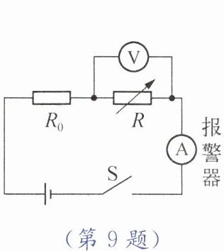 9. 电梯超载容易引发安全隐患,其超载报警电路简图如图所示。电源电压恒定,$R_0$为保护电阻,$R$为压敏电阻,其阻值大小随电梯内压力增大而减小,电流表的示数超过临界值就会自动报警。电梯正常工作,当有人进入电梯后,则(