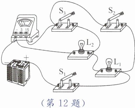 12. 如图所示,电源电压恒定,灯泡$L_1$、$L_2$完全相同。闭合开关$S_1$,断开$S_2$、$S_3$,灯泡$L_1$、$L_2$是