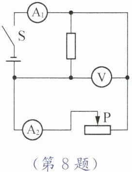 解:由图可知,定值电阻与滑动变阻器并联,电压表测电源电压,电流表$A_1$测干路电流,电流表$A_2$测滑动变阻器支路电流。