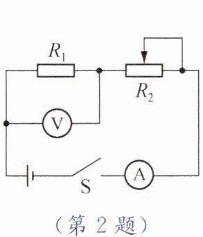 2. 如图所示,电源电压为$4.5\ V$,$R_1$阻值为$6\ \Omega$,滑动变阻器$R_2$规格为“$20\ \Omega\ 1\ A$”,电压表量程为“$0\sim3\ V$”,电流表量程为“$0\sim0.6\ A$”。在保证电路安全的前提下,闭合开关,调节滑动变阻器,下列说法中正确的是(