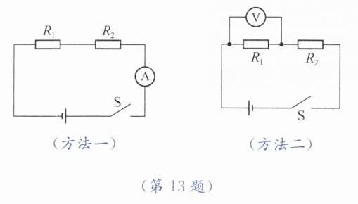 答案:13.【方法一】(1)如图所示 (2)按照电路图连接电路;(3)闭合开关S,读出电流表的示数$I$ (3)$U = I(R_1 + R_2)$【方法二】(1)如图所示 (2)①按照电路图连接电路;②闭合开关S,读出电压表的示数$U_1$ (3)$U = \frac{R_1 + R_2}{R_1}U_1$