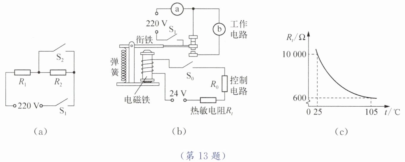 【方案优化】有同学认为图($a$)所示方案不能实现自动切换功能,于是利用电磁继电器与热敏电阻,设计了如图($b$)所示的方案。