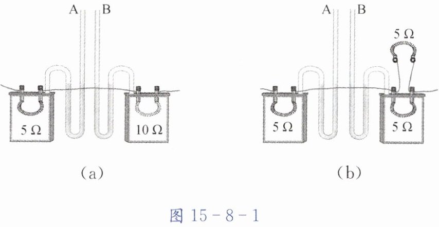 (1) 小明采用了图 15-8-1(a)所示的实验装置,通电一段时间后发现 B 玻璃管内液面上升较高,这表明:在电流和通电时间相同的情况下,导体的