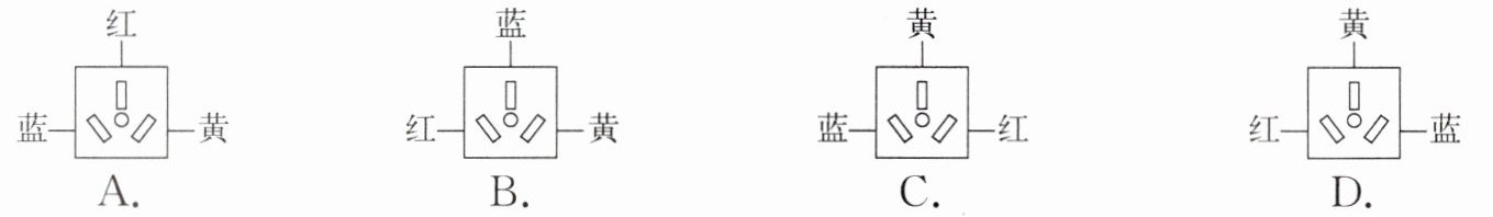 6. 墙壁上的接线盒内有三根电线,其中红线为火线,蓝线为零线,黄线为地线,现将三孔插座与三根电线相连接,下列选项中接线情况正确的是(