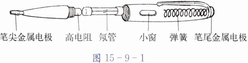4. 如图15 - 9 - 1所示,氖管测电笔由两个金属电极、氖管、弹簧和一个阻值很大的电阻(高电阻)等组成。用氖管测电笔检测时,手要接触测电笔尾部的