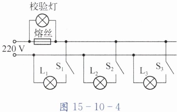 14. 为检查家庭电路的故障,电工可采用以下方法:取下熔丝,将额定电压为 220 V 的“校验灯”